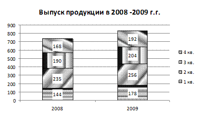 Рис. 63. Окно Мастера диаграмм, вставка графика. Редактирование диаграмм выполняется как с помощью контекстного меню, так и с помощью команд управляющего меню Диаграмма. Пункты контекстного меню предоставляют пользователю возможность вернуться к любому из 4-х этапов создания диаграммы и осуществить необходимые изменения: - изменить тип диаграммы; - изменить исходные данные: o переопределить исходный интервал ячеек, на основании которых построена диаграмма; o переопределить ориентацию рядов и их название; o изменить данные, используемые для подписей оси Х; o изменить параметры диаграммы (заголовки, оси, линии сетки, легенду, подписи данных); - изменить размещение диаграммы. Задание 1. В таблице приведена информация о производстве товаров и их реализации в 2008/09 гг. Рассчитать годовые итоговые показатели и процент реализации продукции (отношение «Реализовано»/«Произведено»).