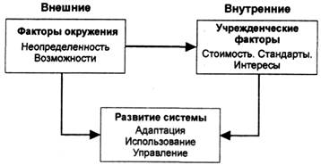 Рис. 2.5 поясняет модель процесса развития систем, которая включает много соображений, отличных от экономических. Эта модель объясняет, почему организации делят системы на две группы: внешнюю, относящуюся к факторам окружающей среды, и внутреннюю. Относящиеся к окружающей среде факторы, внешние по отношению к организации, влияют на создание и структуру информационных систем. Примерами внешних воздействий являются возрастающие затраты рабочей силы или других ресурсов, конкурентоспособные действия других организаций и изменения в правительственных нормах.