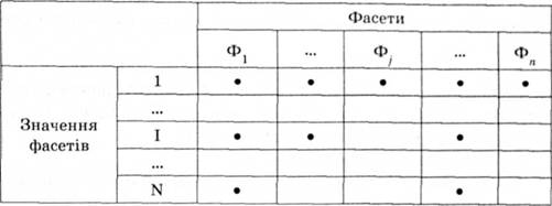 Рис. 2.4. Ієрархічна система класифікації o неможливість групувати об'єкти за непередбаченим заздалегідь поєднанням ознак. Фасетний метод класифікації на відміну від ієрархічного дозволяє вибирати ознаки класифікації, не враховуючи семантику об'єкта класифікації. Кожна ознака фасетної класифікації відповідає фасеті, тобто списку значень найменованої ознаки класифікації. Ознаки класифікації називаються фасетами (facet). Для кожного об'єкта задається множина фасет - під-множина класифікаційних ознак, значення яких для нього визначені. Множинне описання об'єктів техніко-економічної інформації здійснюється в конкретній задачі на основі задання фасетної формули, що утворюється з послідовності ознак класифікації, які використовуються у задачі. Кількість фасетних формул визначається можливим поєднанням ознак. Для кожної фасетної формули може бути утворена ієрархічна класифікація, в якій на кожному рівні поділу використовується одна ознака, що відповідає окремій фасеті, а послідовність ознак визначається фасетною формулою. Процедура класифікації полягає у присвоєнні кожному об'єкту відповідної множини фасетів: УвІ,(= М,3^,?<с{Ф1,...,Фп}. VФ^,/ = й^ де <?,- інформаційні об'єкти, Ф^,у = 1,л - фасети, п - кількість фасетів, к - кількість інформаційних об'єктів, {, - припустиме значення у-ї класифікаційної ознаки. Кожна фасета містить сукупність припустимих значень відповідної класифікаційної ознаки (рис. 2.5).