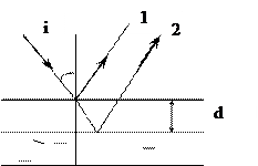 Оптическая разность хода лучей, отраженных от верхней и нижней поверхностей пленки (рис.) D = 2 d где d – толщина пленки; n – показатель преломления пленки; i – угол падения лучей. В выражении (1) учтено, что отражение лучей на верхней и нижней поверхностях пленки происходит от оптически более плотной среды, поэтому потери полуволны в обоих случаях компенсируют друг друга. Условие интерференционного минимума