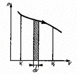 Результат интегрирования определяется характером зависимости между давлением и объемом газа. Найденное для работы выражение (52.2) справедливо при любых изменениях объема твердых, жидких и газообразных тел. Произведенную при том или ином процессе работу можно изобразить графически с помощью кривой в координатах р, V. Пусть изменение давления газа при его расширении изображается кривой на рис. 79. При увеличении объема на dV совершаемая газом работа равна pdV, т. е. определяется площадью полоски с основанием dV, заштрихованной на рисунке. Поэтому полная работа, совершаемая газом при расширении от объема V1 до объема V2,определяется площадью, ограниченной осью абсцисс, кривой p=f(V) и прямыми V1и V2.