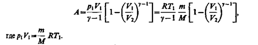 Если газ адиабатически расширяется от объема V\ до V2, то его температура уменьшается от T1до T2и работа расширения идеального газа