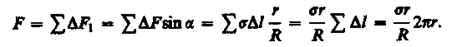 Если поверхность жидкости не плоская, а искривленная, то она оказывает на жидкость избыточное (добавочное) давление. Это давление, обусловленное силами поверхностного натяжения, для выпуклой поверхности положительно, а для вогнутой поверхности — отрицательно. Для расчета избыточного давления предположим, что свободная поверхность жидкости имеет форму сферы радиуса R, от которой мысленно отсечен шаровой сегмент, опирающийся на окружность радиуса г = Rsina (рис. 100). На каждый бесконечно малый элемент длины D l этого контура действует сила поверхностного натяжения DF = sD l, касательная к поверхности сферы. Разложив DF на два компонента (DF1 и DF2), видим, что геометрическая сумма сил DF2 равна нулю, так как эти силы на противоположных сторонах контура направлены в обратные стороны и взаимно уравновешиваются. Поэтому равнодействующая сил поверхностного натяжения, действующих на вырезанный сегмент, направлена перпендикулярно плоскости сечения внутрь жидкости и равна алгебраической сумме составляющих DF1: