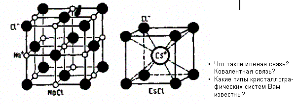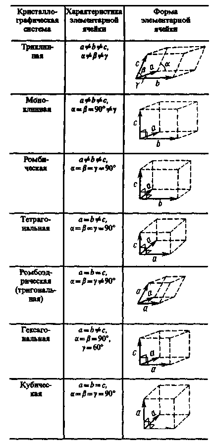 Существует два признака для классификации кристаллов: 1) кристаллографический; 2) физический (природа частиц, расположенных в узлах кристаллической решетки, и характер сил взаимодействия между ними). 1. Кристаллографический признак кристаллов. В данном случае важна только пространственная периодичность в расположении частиц, поэтому можно отвлечься от их внутренней структуры, рассматривая частицы как геометрические точки. Кристаллическая решетка может обладать различными видами симметрии. Сим метрия кристаллической решетки — ее свойство совмещаться с собой при некоторых пространственных перемещениях, например параллельных переносах, поворотах, отражениях или их комбинациях и т. д. Кристаллической решетке, как доказал русский кристаллограф Е. С. Федоров (1853—1919), присущи 230 комбинаций элементов сим метрии, или 230 различных пространственных групп. С переносной симметрией в трехмерном пространстве связывают понятие трехмерной периодической структуры — пространственной решетки, или решетки Бравэ, представление о которой введено французским кристаллографом О. Бравэ (1811—1863). Всякая пространственная решетка может быть составлена повторением в трех различных направлениях одного и того же структурного элемента — элементарной ячейки. Всего существует 14 типов решеток Бравэ, различающихся по виду переносной симметрии. Они распределяются по семи кристаллографическим системам, или сингониям, представленным в порядке возрастающей симметрии в табл. 3. Для описания элементарных ячеек пользуются кристаллографическими осями координат, которые проводят параллельно ребрам элементарной ячейки, а начало координат выбирают в левом углу передней грани элементарной ячейки. Элементарная кристаллическая ячейка представляет собой параллелепипед, построенный на ребрах а, b, с с углами a, b и g между ребрами (табл. 3). Величины a, b и с и a, b и g называются параметрами элементарной ячейки и однозначно ее определяют. 2. Физический признак кристаллов. В зависимости от рода частиц, расположенных в узлах кристаллической решетки, и характера сил взаимодействия между ними кристаллы разделяются на четыре типа: ионные, атомные, металлические, молекулярные. Ионные кристаллы. В узлах кристаллической решетки располагаются поочередно ионы противоположного знака. Типичными ионными кристаллами являются большинство галоидных соединений щелочных металлов (NaCl, CsCl, КВг и т. д.), а также оксидов различных элементов (MgO, CaO и т. д.). Структуры решеток двух наиболее характерных ионных кристаллов — NaCl (решетка представляет собой две одинаковые гранецентрированные кубические решетки, вложенные друг в друга; в узлах одной из этих решеток находятся ионы Na+, в узлах другой — ионы Cl-) и CsCl (кубическая объемно центрированная решетка — в центре каждой элементарной решетки находится ион) — показаны на рис. 103.