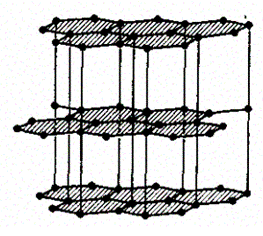 Металлические кристаллы. В узлах кристаллической решетки располагаются положительные ионы металла. При образовании кристаллической решетки валентные электроны, сравнительно слабо связанные с атомами, отделяются от атомов и коллективизируются: они уже принадлежат не одному атому, как в случае ионной связи, и не паре соседних атомов, как в случае гомеополярной связи, а всему кристаллу в целом. Таким образом, в металлах между положительными ионами хаотически, подобно молекулам газа, движутся «свободные» электроны, наличие которых обеспечивает хорошую электропроводность металлов. Так как металлическая связь не имеет направленного действия и положительные ионы решетки одинаковы по свойствам, то металлы должны иметь симметрию высокого порядка. Действительно, большинство металлов имеют кубическую объемно центрированную (Li, Na, К, Rb, Cs) и кубическую гранецентрированную (Си, Ag, Pt, Аи) решетки. Чаще всего металлы встречаются в виде поликристаллов. Молекулярные кристаллы. В узлах кристаллической решетки располагаются ней тральные молекулы вещества, силы взаимодействия между которыми обусловлены незначительным взаимным смещением электронов в электронных оболочках атомов. Эти силы называются ван-дер-ваальсовыми, так как они имеют ту же природу, что и силы притяжения между молекулами, приводящими к отклонению газов от идеальности. Молекулярными кристаллами являются, например, большинство органических соединений (парафин, спирт, резина и т. д.), инертные газы (Не, Аг, Кг, Хе) и газы СО2, О2) N2 в твердом состоянии, лед, а также кристаллы брома Вг2) иода I2. Ван-дер-ваальсовы силы довольно слабые, поэтому молекулярные кристаллы легко деформируются. В некоторых твердых телах одновременно может осуществляться несколько видов связи. Примером может служить графит (гексагональная решетка). Решетка графита (рис. 105) состоит из ряда параллельных плоскостей, в которых атомы углерода расположены в вершинах правильных шестиугольников. Расстояние между плоскостями более чем в два раза превышает расстояние между атомами шестиугольника.