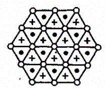 Рассмотрим, при каких условиях плотная упаковка шаров в пространстве может соответствовать той или иной кристаллической структуре, приводимой ранее. Начнем строить решетку со слоя шаров, представленных на рис. 106, б. Для упрощения дальнейших рассуждений спроецируем центры шаров на плоскость, на которой они лежат, обозначив их белыми кружками (рис. 107). На эту же плоскость спроецируем центры просветов между шарами, которые обозначены на рис. 107 соответственно черными кружками и крестиками. Любой плотноупакованный слой будем называть слоем А, если центры его шаров расположены над серыми кружками, слоем В — если над красными кружками, слоем С — если над крестиками. Над слоем А уложим второй плотноупакованный слой так, чтобы каждый шар этого слоя лежал на трех шарах первого слоя. Это можно сделать двояко: взять в качестве второго слоя либо В, либо С. Третий слой можно опять уложить двояко и т. д. Итак, плотную упаковку можно описать как последовательность АВСВАС..., в которой не могут стоять рядом слои, обозначенные одинаковыми буквами.