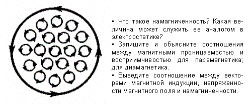 где I и I' — соответственно алгебраические суммы макротоков (токов проводимости) и микротоков (молекулярных токов), охватываемых произвольным замкнутым кон туром L. Таким образом, циркуляция вектора магнитной индукции В по произвольному замкнутому контуру равна алгебраической сумме токов проводимости и молекулярных токов, охватываемых этим контуром, умноженной на магнитную постоянную. Вектор В, таким образом, характеризует результирующее поле, созданное как макроскопическими токами в проводниках (токами проводимости), так и микроскопическими токами в магнетиках, поэтому линии вектора магнитной индукции В не имеют источников и являются замкнутыми. Из теории известно, что циркуляция намагниченности J по произвольному замкнутому контуру L равна алгебраической сумме молекулярных токов, охватываемых этим контуром: