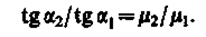 Таким образом, при переходе через границу раздела двух магнетиков нормальная составляющая вектора В (Bn и тангенциальная составляющая вектора H (Ht) изменяются непрерывно (не претерпевают скачка), а тангенциальная составляющая вектора В (Вt) и нормальная составляющая вектора Н (Нn)претерпевают скачок. Из полученных условий (134.1)—(134.4) для составляющих векторов В и Н следует, что линии этих векторов испытывают излом (преломляются). Как и в случае диэлектриков (см. § 90), можно найти закон преломления линий В (а значит, и линий Н):