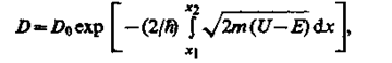 где U— высота потенциального барьера, Е— энергия частицы, l — ширина барьера, D0— постоянный множитель, который можно приравнять единице. Из выражения (221.7) следует, что D сильно зависит от массы mчастицы, ширины l барьера и от (U - E);чем шире барьер, тем меньше вероятность прохождения сквозь него частицы. Для потенциального барьера произвольной формы (рис. 299), удовлетворяющей условиям так называемого квазиклассического приближения (достаточно гладкая форма кривой), имеем