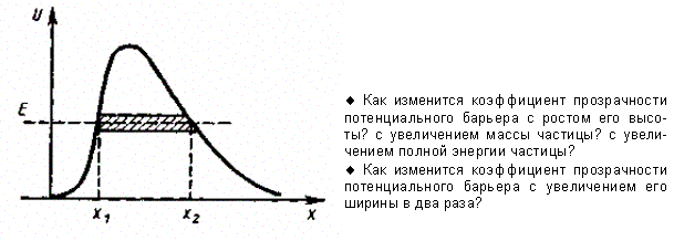При данных условиях задачи классическая частица, обладая энергией Е, либо беспрепятственно пройдет над барьером (при Е > U),либо отразится от него (при Е < U)и будет двигаться в обратную сторону, т. е. она не может проникнуть сквозь барьер. Для микрочастицы же, даже при E > U, имеется отличная от нуля вероятность, что частица отразится от барьера и будет двигаться в обратную сторону. При E < Uимеется также отличная от нуля вероятность, что частица окажется в области х > l,т. е. проникает сквозь барьер. Подобные, казалось бы, парадоксальные выводы следуют непосредственно из решения уравнения Шредингера, описывающего движение микро частицы при условиях данной задачи.