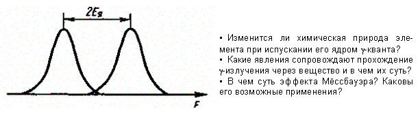 Как уже указывалось, дискретный спектр g-излучения обусловлен дискретностью энер гетических уровней ядер атомов. Однако, как следует из соотношения неопределен ностей (215.5), энергия возбужденных состояний ядра принимает значения в пределах DЕ» h/Dt, где Dt — время жизни ядра в возбужденном состоянии. Следовательно, чем меньше Dt, тем больше неопределенность энергии DЕвозбужденного состояния. DЕ = 0 только для основного состояния стабильного ядра (для него Dt®¥). Неопределенность энергии квантово-механической системы (например, атома), обладающей дискретными уровнями энергии, определяет естественную ширину энергетического уровня (Г).Например, при времени жизни возбужденного состояния, равного 10-13 с, естественная ширина энергетического уровня примерно 10-2 эВ. Неопределенность энергии возбужденного состояния, обусловливаемая конечным временем жизни возбужденных состояний ядра, приводит к немонохроматичности g-излучения, испускаемого при переходе ядра из возбужденного состояния в основное. Эта немонохроматичность называется естественной шириной линии g-излучения. При прохождении g-излучения в веществе помимо описанных выше (см. § 259) процессов (фотоэффект, комптоновское рассеяние, образование электронно-позитронных пар) должны в принципе наблюдаться также резонансные эффекты. Если ядро облучить g-квантами с энергией, равной разности одного из возбужденных и основного энергетических состояний ядра, то может иметь место резонансное поглощение g-нзлучення ядрами: ядро поглощает g-квант той же частоты, что и частота излучаемого ядром g-кванта при переходе ядра из данного возбужденного состояния в основное. Наблюдение резонансного поглощения g-квантов ядрами считалось долгое время невозможным, так как при переходе ядра из возбужденного состояния с энергией Е восновное (его энергия принята равной нулю) излучаемый g-квант имеет энергию Еgнесколько меньшую, чем Е, из-за отдачи ядра в процессе излучения: