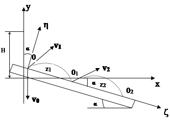 ТЕОРИЯ: Одним из наиболее простых примеров движения является движение тела, падающего на наклонную плоскость. Шарик, падая с некоторой высоты Н, ударяется о наклонную плоскость в точке О (рис 1), отскакивает от плоскости и движется по некоторой кривой. Затем он падает на наклонную плоскость в точке О' и снова отскакивает. Этот процесс повторяется несколько раз.