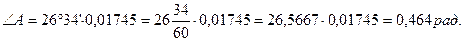 Заметим что tg A > 0, так как угол А - острый. Из таблицы (например, Брадиса) видно, что такое значение тангенса соответствует углу А=26°34/. Обратите внимание на то, что ответ следует дать в радианах. Для перевода градусов в радианы можно воспользоваться соответствующими таблицами, либо формулой: