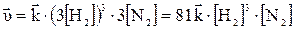 Такое изменение концентрации увеличивает скорость прямой реакции в 81 раз, а обратное в 9 раз, т.е. при увеличении давления в три раза состояние равновесия достигается быстрее в 81: 9 = 9 раз. В левой части уравнения участвуют в реакции 3 + 1 = 4 моль веществ, а в правой части уравнения получается 2 моль, поэтому увеличение давления приводит к повышению выхода целевого продукта, что подтверждает принцип Ле Шателье. Пример 2. При синтезе аммиака N2(г) + 3H2(г)