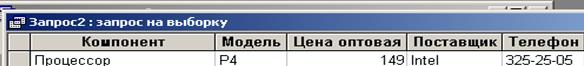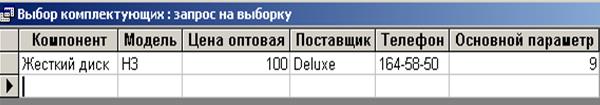 Упражнение 3.Создание запроса на выборку СОЗДАЙТЕ ЗАПРОС на выборку жестких дисков, имеющих емкость НЕ МЕНЕЕ 8 Гбайт при цене МЕНЕЕ 150. Результирующая таблица должна содержать АДРЕС ПОСТАВЩИКА и НОМЕР ТЕЛЕФОНА. 1. Открыть базу данных «Комплектующие». 2. На панели «Запросы» создайте запрос в режиме Конструктор. 3. В д.о. «Добавление таблицы» выберите таблицу «Поставщики» и «Добавьте» ее. Закройте это окно. 4. В бланке запроса в списке полей таблицы «Поставщики» выберите поля для запроса: Компонент, Модель, Цена оптовая, Поставщики, Телефон. 5. Условия отбора для поля Компонент: Жесткий диск. 6. Условия отбора для поля Цена: <150. 7..Поле Основной параметр находится в таблице «Комплектующие», но благодаря связи этих таблиц по полю Модель мы можем ввести условие в этом поле. 8. Рядом с таблицей «Поставщики» щелкните правой клавишей и в контекстном меню Добавьте таблицу «Комплектующие». 9. Добавьте поле Основной параметр в списке полей таблицы «Комплектующие» 10. Условия отбора для поля для поля Основной параметр: >8. 11. Закройте бланк запроса, сохранив его под именем «Выбор комплектующих». 12. В д.о. откройте этот запрос.
