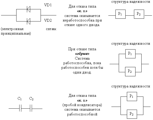 Структура системы – логическая схема взаимодействия элементов, определяющая работоспособность системы или иначе графическое отображение элементов системы, позволяющее однозначно определить состояние системы (работоспособное/неработоспособное) по состоянию (работоспособное/ неработоспособное) элементов. По структуре системы могут быть: · система без резервирования (основная система); · системы с резервированием. Для одних и тех же систем могут быть составлены различные структурные схемы надежности в зависимости от вида отказов элементов (см. таблицу).