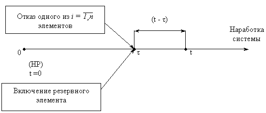 ВБР системы за наработку (0, t) равна: P(A) = P(A1) + P(A2), где P(A) = Pс (t); P(A1 ) = P1 (t) = P0c (t) = Pn (t) – ВБР основной системы (ОС) к моменту t, где P1 (t) = … = Pn (t) = P (t) – ВБР каждого из P(A2 ) = P2 (t) – ВБР для события A2. Для определения вероятности P(A2 ), рассмотрим событие A2: A121 = {отказ одного (первого) из A122 = {БР переключающего устройства (ПУ) до наработки A123 = {БР РЭ после включения его в работу, т. е. на интервале (t - Очевидно, что A12 = A121 поэтому P(A12) = P(A121) · P(A122) · P(A123). Индекс 1 – отказ 1 элемента ОС. Соответствующие вероятности: 1. Выделяется бесконечно малый интервал [ f( 2. ВБР ПУ до момента 3. ВБР РЭ с момента Тогда ВБР системы в течение наработки [ f( Интегрируя по всем