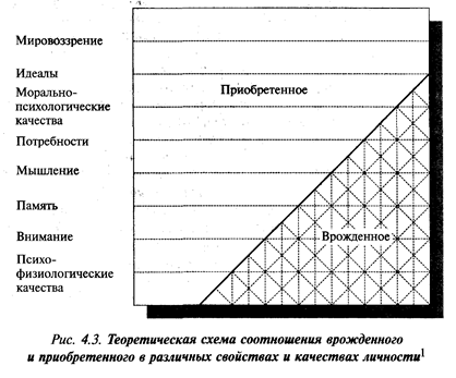 Решение вопроса о соотношении врожденного (биологического) и приобретенного (социального) часто неоправданно связывается с глобальным вопросом: «Чего в личности больше: биологического или социального?». Истина же лежит в ответе на другой вопрос: «О каких свойствах и качествах личности идет речь?». При ответе на него становится ясным, что соотношение врожденного и приобретенного, биологического и социального не есть величина, постоянная для личности. В разных свойствах и качествах их соотношение различно (рис. 4.3). Чем выше иерархический уровень психологической сферы личности, тем меньше в ней и относящихся к ней качествах доля врожденного и тем больше измененного, прижизненно приобретенного, опосредованного социально. Направленность и морально-психологические особенности главным образом определяют в личности ее социальное качество, а именно в них доля приобретенного в жизни безусловно доминирует (в убеждениях, взглядах, жизненных целях вообще трудно найти какие-либо врожденные предпосылки).