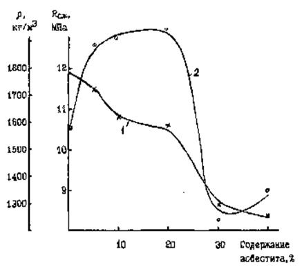 Проведенные на сырье и оборотной воде ОАО Белгородасбестоцемент лабораторные исследования подтвердили, что с рециркуляционной водой может быть возвращен в технологический цикл почти весь образующийся асбестит. При этом введение до 1,5 % асбестита (от веса сухих сырьевых материалов) незначительно меняет качество готовой продукции. Однако, как и следовало ожидать, даже такое небольшое введение шлама в изделие, твердеющее в условиях пропарки, вызывает, пусть и небольшое, но ухудшение прочностных характеристик. Остаточное количество асбестита, а также асбестит в отвалах может быть использован для производства гранулированного заполнителя и последующего выпуска на его основе конструкционно-теплоизоляционных бетонов. Промышленные испытания, проведенные в ОАО «Белгородасбестоцемент», показали возможность производства асбеститоцементнопесчаных пустотелых бетонных стеновых блоков с плотностью 900-1600 кг/м3. Причем, основой гранул служит обезвоженный асбестит из отвалов, а доведение массы до технологической влажности производят сконцентрированной суспензией асбестита с влажностью около 80%. Технологическим приемом, снижающим влияние структурной неустойчивости асбестита, является предварительная пропарка (обработка паром при температурах до 80-900С) или запарка (обработка насыщенным паром при повышенном давлении и температуре до 1800С) гранул. Разработана технология производства стеновых асбеститоцементнопесчаных бетонных камней. Достаточно эффективным является использование асбестита для производства силикатных бетонов. Причем, и в этом случае асбестит лучше вводить с использованием предлагаемой технологии в виде суспензии на стадии гашения извести. Лабораторные исследования, проведенные на сырье и в технологических условиях ОАО «Стройматериалы», показали возможность повышения прочности бетона при снижении его плотности. На рис. 6 показана зависимость физико-механических свойств силикатного бетона от содержания асбестита (содержание гашеной извести в образцах постоянно – 10% от массы песка, испытания проводились на образцах – цилиндрах диаметром и высотой 30 мм, давление прессования 20 МПа, запарка изделий проводилась при давлении 1,0 МПа в течение 6 часов). С использованием технологических приемов, исключающих глубокое обезвоживание шламовых отходов, решались соответствующие проблемы в объединении строительных материалов и бытовой техники (ОСМиБТ), где производят изделия санитарно-технической керамики, плитку, а также кирпич и черепицу [10]. Было предложено для предварительного разделения суспензий использовать цеховые накопители. При этом подвергается быстрому осаждению наиболее крупнодисперсная фракция. Верхние слои воды, в которых присутствуют самые тонкодисперсные примеси, сбрасываются на участок водоподготовки, где с использованием реагентов очищаются в отстойнике-осветлителе и шламоуплотнителе. Дополнительное обезвоживание шламов, например, с помощью фильтр-прессов, оказывается нетехнологичным, так как обезвоженные шламы с влажностью 50-60% трудно транспортировать и дозировать для последующего использования в производстве. Это, в принципе, свойственно для всех шламовых отходов. Поэтому шламы после шламоуплотнителя с влажностью около 80% направляются в цех подготовки материалов. Туда же направл