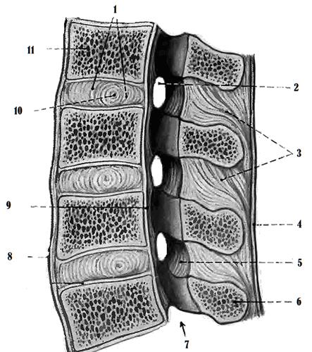 Рис. 3. Позвонки и их соединении,.вид сбок: 1 – фибриозное кольцо; 2 – межпозвоночное отверстие; 3 – межостистая связка; 4 – надостистая связка; 5 – желтая связка; 6 – остистый отросток; 7 – позвоночный канал; 8 – передняя продольная связка; 9 – задняя продольная связка, 10 – пульпозное ядро; 11 – тело позвонка. Тела соседних позвонков соединяются посредством межпозвоночных дисков, discus intervertebralis. Межпозвоночный диск состоит из центральной и периферической частей. Периферическая часть представлена соединительной тканью, волокна которой образуют фиброзное кольцо, anulus fibrosus. Центральная часть диска состоит из эластического вещества, получившего название студенистого ядра, nucleus pulposus (хрящ). С помощью волокон фиброзного кольца соседние позвонки соединяются друг с другом, а студенистое ядро выполняет роль амортизатора. При отсутствии студенистого ядра внутри диска образуется щель, что позволяет отнести данное соединение тел позвонков к полусуставам (симфизам). Соединение тел позвонков укрепляется двумя продольными связками, ligg. longitudinalia – передней и задней. Между дугами и отростками позвонков (остистыми и поперечными) также располагается комплекс связок, укрепляющих их соединение: желтые, меж- и надостистые, межпоперечные (ligg. flava, inter- et supraspinalia, intertransversaria). Дугоотростчатые (или межпозвонковые) суставы (artt. zygapophysiales) – рис. 3. Классификация. О тносятся к комбинированным, плоским, многоосным. Строение. Образуются суставными отростками смежных позвонков. Капсула прикрепляется по краю суставных поверхностей. Укрепляются комплексом связок между телами, дугами, отростками позвонков (см. выше). Функции. Движения ограничены в объеме между отдельно взятыми позвонками, однако в целом позвоночный столб достаточно подвижен: вокруг фронтальной оси – сгибание вперед и разгибание назад; вокруг сагиттальной оси – наклоны вправо и влево; вокруг вертикальной оси – повороты (торзио) направо и налево.