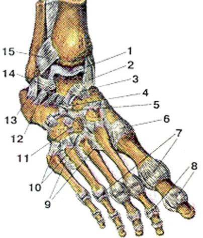 Рис. 12. Суставы и связки стопы, правой. Тыльная поверхность: 1 – голеностопный сустав (вскрыт, капсула удалена), 2 – медиальная (дельтовидная) связка, 3 – тыльная таранно-ладьевидная связка, 4 – пяточно-ладьевидная связка, 5 – пяточно-кубовидная связка, 6 – I предплюсне-плюсневый сустав, 7 – плюсне-фаланговые суставы (IV и V вскрыты), 8 – межфаланговые суставы, 9 – тыльные плюсневые связки, 10 – тыльные предплюсне-плюсневые связки, 11 – тыльная клино-кубовидная связка, 12 – латеральная таранно-пяточная связка, 13 – пяточно-малоберцовая связка, 14 – передняя таранно-малоберцовая связка, 15 – передняя межберцовая связка. Строение. Образован нижней суставной поверхностью большеберцовой кости, суставными поверхностями лодыжек обеих берцовых костей и блока таранной кости. Капсула прикрепляется по краю суставных поверхностей. Сустав укрепляется наружными связками: дельтовидной, lig. deltoideum (медиально); пяточно-малоберцовой, передней и задней таранно-малоберцовыми, ligg. calcaneofibulare, talofibulare anterius et posterius(латерально). Функции. В суставе возможны движения вокруг фронтальной оси – сгибание (подошвенное) и разгибание стопы. Суставы стопы –рис. 12, 13. Суставы предплюсны (artt. intertarseae). Включают суставы, образованные пяточной, таранной, ладьевидной, кубовидной и клиновидными костями: подтаранный, таранно-пяточно-ладьевидный, пяточно-кубовидный, клино-ладьевидный. Капсулы отдельные для каждого сустава, прикрепляются по краю суставных поверхностей. Укрепляются суставы предплюсны комплексом тыльных и подошвенных связок, среди которых стоит отметить длинную подошвенную связку (lig. plantare longum), как наиболее значимую в формировании сводов стопы. Эта связка начинается от нижней поверхности пяточной кости, проходит вдоль стопы и прикрепляется веерообразно к основанию всех плюсневых костей и к кубовидной кости. Функции. В подтаранном и таранно-пяточно-ладьевидном суставах возможны единые движения: при приведении и вращении стопы кнаружи (приподнимается внутренний край стопы) – происходит ее сгибание, а при отведении и вращении внутрь (приподнимается наружный край стопы) – происходит разгибание стопы. Движения в остальных суставах ограничены. Возможно лишь небольшое вращение вокруг переднезадней оси как дополнение к движениям в таранно-пяточно-ладьевидном суставе.
