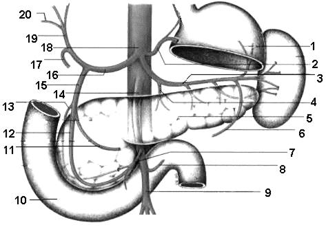 Рис. Ветви чревного ствола и верхней брыжеечной артерии. 1 – короткие желудочные артерии; 2 – левая желудочная артерия; 3 – селезеночная артерия; 4 – ветви к телу поджелудочной железы; 5 – поджелудочная железа; 6 – левая желудочно-сальниковая артерия; 7 – нижняя поджелудочно-двенадцатиперстная артерия; 8 – средняя ободочная артерия; 9, 14 – верхняя брыжеечная артерия; 10 – двенадцатиперстная кишка; 11 – правая желудочно-сальниковая артерия; 12 – передняя верхняя поджелудочно-двенадцатиперстная артерия; 13 – задняя верхняя поджелудочно-двенадцатиперстная артерия; 15 – желудочно-двенадцатиперстная артерия; 16 – общая печеночная артерия; 17 – правая желудочная артерия; 18 – чревный ствол; 19 – собственная печеночная артерия; 20 – пузырная артерия. Парные висцеральные ветви брюшной части аорты. Средняя надпочечниковая артерия, a. suprarenalis media, направляется к воротам надпочечника, анастомозируя с верхними и нижними надпочечниковыми артериями. Почечная артерия, a. renalis, отходит от аорты на уровне I-II поясничного позвонка к воротам почки. Правая почечная артерия проходит позади нижней полой вены. На своем пути почечная артерия отдает нижнюю надпочечниковую артерию (a. suprarenalis inferior). Яичковая (яичниковая) артерия, а. testicularis (a. ovarica), – отходит от аорты ниже почечной артерии под острым углом. У мужчин яичковая артерия идет через паховый канал к яичку, у женщин яичниковая артерия в толще связки, подвешивающей яичник, достигает яичника.