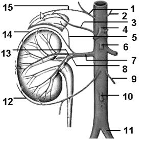 Рис. Ветви брюшной аорты. Кровоснабжение почек и надпочечников. 1 – правая нижняя диафрагмальная артерия; 2 – левая нижняя диафрагмальная артерия; 3 – правая средняя надпочечниковая артерия; 4 – чревный ствол; 5 – правая нижняя надпочечниковая артерия; 6 – верхняя брыжеечная артерия; 7 – правая почечная артерия; 8 – задняя ветвь почечной артерии; 9 – левая яичковая (яичниковая) артерия; 10 – нижняя брыжеечная артерия; 11 – левая общая подвздошная артерия; 12 – добавочная ветвь к нижнему полюсу правой почки; 13 – передняя ветвь почечной артерии; 14 – добавочная ветвь к верхнему полюсу правой почки; 15 – правая верхняя надпочечниковая артерия.