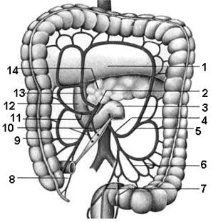 Рис. Артерии толстой кишки. 1 – брыжейка поперечной ободочной кишки; 2 – верхняя брыжеечная артерия; 3 – двенадцатиперстно-тощекишечный изгиб; 4 – нижняя брыжеечная артерия; 5 – левая ободочная артерия; 6 – сигмовидные артерии; 7 – верхняя прямокишечная артерия; 8 – артерия червеобразного отростка; 9 – подвздошно-ободочная артерия; 10 – тонкокишечные артерии; 11 – правая ободочная артерия; 12 – нисходящая часть двенадцатиперстной кишки; 13 – средняя ободочная артерия; 14 – поджелудочная железа. На уровне тела IV поясничного позвонка брюшная часть аорты делится на две общие подвздошные артерии, образуя бифуркацию аорты (bifurcatio aortae), а сама продолжается в тонкий сосуд – срединную крестцовую артерию (a. sacralis mediana), уходящую в малый таз по тазовой поверхности крестца. Общая подвздошная артерия, a. iliaca communis следует в малый таз и на уровне крестцово-подвздошного сустава делится на внутренюю и наружную подвздошные артерии.