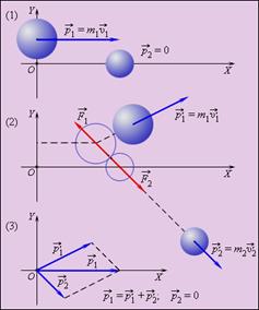 Это равенство означает, что в результате взаимодействия двух тел их суммарный импульс не изменился. Рис. 1.4.1 иллюстрирует закон сохранения импульса на примере нецентрального соударения двух шаров разных масс, один из которых до соударения находился в состоянии покоя.