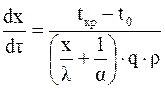 где tкр, t0 – cоответственно криоскопическая температура продукта и температура охлаждающей среды, 0С; х – определяющий размер продукта, м; λ – коэффициент теплопроводности продукта, Вт/(м·К); α – коэффициент теплоотдачи, Вт/(м2·К); удельное количество теплоты, отводимое от продукта при замораживании, кДж/кг; ρ – плотность продукта, кг/м3.