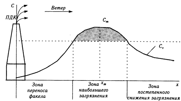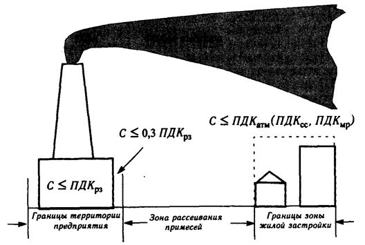 Рис. 8.2. Схема распространения аэрополлютантов и требования к нормированию вредных примесей в воздухе