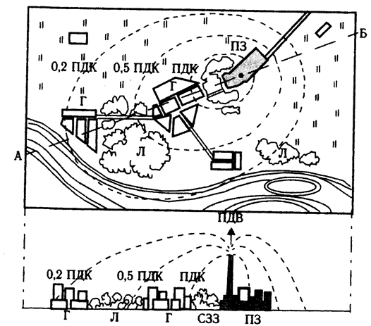 Рис. 8.4. Распределение концентрации загрязняющих веществ в атмосфере под факелом организованного высокого источника выбросов (трубы) Г - городская жилая застройка; Л - лес, лесопарковая зона; СЗЗ - санитарно-защитная зона; ПЗ - производственная зона. Пунктирные линии - изолинии концентрации загрязнителей