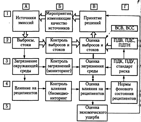 Рис. 8.5. Общая схема контроля загрязнения окружающей среды 1-5 - этапы воздействия и откликов; А - уровень процессов; Б - уровень контроля и коррекции; В - уровень оценок и принятия решений; Г - уровень нормативов. Минимальный контур практического регулирования обозначен светлыми стрелками