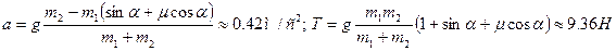 15. Тік бұрышты үшбұрыштың төбесіне бекітілген блок арқылы асыра тасталған жіптің ұштарына массалары 2 кг және 1 кг жүктер байланған. Көлбеулік бұрышы 200. Ауыр жүк көлбеу бетінде орналасқан. Осы жүк пен көлбеу жазықтықтың арасындағы үйкеліс коэффициенті 0,1 тең. Жүктерді бастапқы жылдамдықсыз төмен түсіреді. А) жүктер жүйесінің үдеуін және жіптің керілу күшін табыңдар. В) егер үйкеліс коэффициенті 0,3 болса, жауап қалай өзгерер еді?