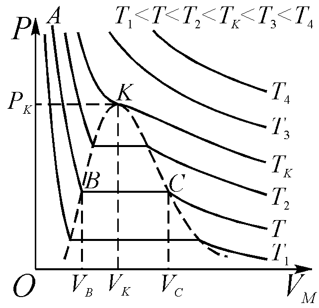 Рассмотрим изотерму с температурой T. Выделим на ней три участка AB, BC, CT: Участок CT – процесс изотермического сжатия газа; Участок BC – в точке С газ начинает конденсироваться в жидкость и в точке В газ полностью переходит в жидкое состояние. Участок АВ – процесс сжатия жидкости.