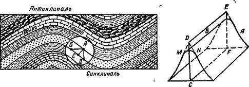 1. 1. Формы залегания осадочных горных пород Под влиянием глубинных процессов происходят колебательные, складчатые и разрывные движения земной коры. Вследствие колебательных движений нарушается горизонтальное положение пластов осадочных горных пород и образуются пологие прогибы (синеклизы) и вздутия (антеклизы). Складчатые движения приводят к образованию складок, характеризующихся антиклиналями и синклиналями (рис. 1). Складка имеет следующие элементы (рис. 2): 1) крылья А — боковые части складки (в синклиналях они называются бортами); 2) замок Б — линия перегиба, соединяющая между собой крылья (борта); замковая часть антиклинали называется седлом, синклинали — мульдой; 3) осевая плоскость СДЕР; 4) ось складки CF; 5) угол складки MDN.