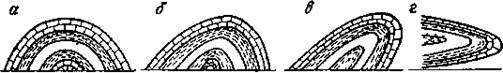 В зависимости от положения осевой плоскости в пространстве и характера падения крыльев складка может быть прямой, косой, опрокинутой, лежачей (рис 3) и однокрылой, называемой моноклиналью или флексурой (рис. 4).