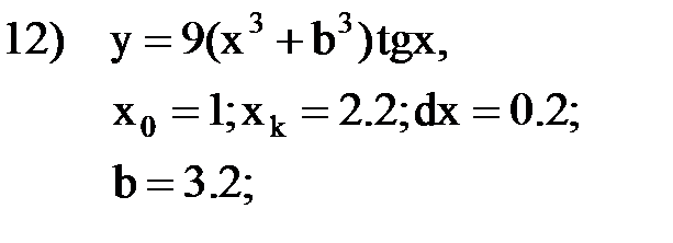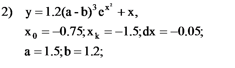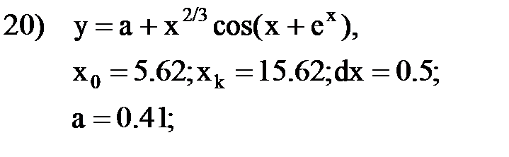 После отладки программы следует проверить правильность работы программы с помощью контрольного примера, приведенного на рис. 4.4. Установите точку останова на оператор перед циклом и запустите программу. После попадания на точку остановки, выполните пошагово программу и проследите, как меняются все переменные в процессе выполнения. Индивидуальные задания Составьте программу табулирования функции y(x), выведите на экран значения x и y(x). Нужный вариант задания выберите из нижеприведенного списка по указанию преподавателя. Откорректируйте элементы управления в форме в соответствии со своим вариантом задания.