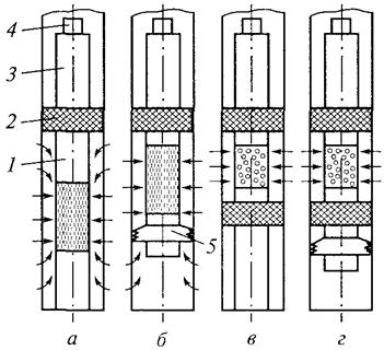 Принцип работы трубного пластоиспытателя заключается в том, что при помощи пакера (при селективном испытании двух пакеров) изолируют интервал, подлежащий испытанию, от остальной части ствола. Затем снижают давление для получения необходимой депрессии в подпакерном или междупакерном пространстве. Величину депрессии регулируют за счет высоты столба жидкости в колонне бурильных труб, а также ее плотности. Под влиянием депрессии пластовые флюиды поступают в скважину, а из нее — через фильтр в колонну бурильных труб. Глубинный манометр, установленный в испытателе пластов, записывает все происходящие в скважине изменения в давлении. Специальным пробоотборником отбирают пробы поступивших в колонну бурильных труб пластовых флюидов (нефть, вода) или поднимают их на поверхность непосредственно в испытателе пластов. Термометр, установленный в специальном кармане пластоиспытателя, фиксирует забойную температуру. Выбор конструкции призабойной части скважины Осуществляется до начала бурения скважины в зависимости от ее местоположения на залежи, литологического и физического свойств пласта, наличия в кровле и подошве пласта водоносных горизонтов и ряда других факторов. Если пласт сложен устойчивыми породами и не содержит пропластков обваливающихся глин, то ствол скважины целесообразно оставить открытым (рис. 2, а).
