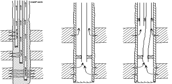 Скважину бурят несколько ниже подошвы продуктивного пласта, спускают эксплуатационную колонну, цементируют ее одно- или двухступенчатым способом. После твердения цементного раствора против продуктивного пласта перфорируют стенку колонны и цементное кольцо для сообщения эксплуатационной колонны с пластом (рис. 2, г, д и рис. 3, а). Иногда в целях предотвращения попадания песка в эксплуатационную колонну устанавливают фильтр (рис. 3, б). В некоторых случаях внутри одной скважины обнаруживается несколько продуктивных горизонтов. Многопластовое заканчивание скважины позволяет одновременно проводить добычу из двух или более горизонтов. Это может быть необходимо для регулирования работы систем коллектор — пласт с высоким давлением и коллектор—пласт с низким давлением. Наиболее распространенным является заканчивание в двух горизонтах (рис. 4).