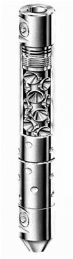 Контрольный отвод 4 с вентилем 5 служит для отвода газа из затрубного пространства. Сообщение эксплуатационной колонны с пластом (перфорация). При применении конструкции призабойной части скважины с зацементированной эксплуатационной колонной сообщение эксплуатационной колонны с пластом осуществляют после прострела отверстий в колонне, окружающем ее цементном кольце и в породе пласта при помощи специальных аппаратов — перфораторов. Существует несколько типов перфораторов: пулевые, торпедные, кумулятивные и гидропескоструйная. Пулевой перфоратор — это многоствольное «огнестрельное оружие», сконструированное для опускания в скважину. Перфоратор располагают на заданной глубине и приводят в действие электрическим выключателем с пульта управления на поверхности. Перфорация, т.е. проникновение сквозь трубу, цемент в пласт горной породы, осуществляется на большой скорости пулями калибром 11-13 мм. Для прострела обсадных труб, цементного кольца и пласта, сложенного устойчивыми породами, в нагнетательных скважинах применяют торпедные перфораторы, выстрел из которых производится разрывными снарядами диаметром 22 — 32 мм. После выстрела снаряд проходит в породу на глубину 200 — 250 мм и там разрывается. В результате взрыва в породе образуется каверна диаметром до 300 мм. Основной недостаток пулевой и торпедной перфорации заключается в том, что во время простреливания цементный камень в затрубном пространстве может растрескаться. Наиболее распространены кумулятивные перфораторы, позволяющие пробивать отверстия кумулятивной струей в стальных обсадных трубах, цементном камне и создавать глубокие каналы в прилегающей к призабойной зоне породе (рис. 6).