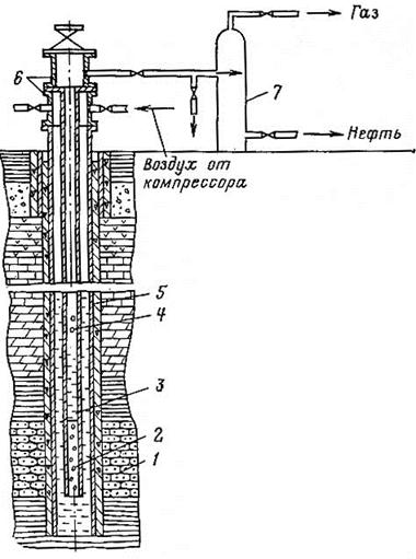 В последнее время начали широко применять новый метод— гидропескоструйную перфорацию. При этом методе через насосно-компрессорные трубы, спущенные в эксплуатационную колонну, под большим давлением нагнетают жидкость с песком. На конце труб устанавливается струйный аппарат, из сопел которого с большой скоростью выбрасывается жидкость с песком. Эта смесь вызывает быстрое абразивное разрушение обсадной колонны, цементного кольца и породы. При гидропескоструйной перфорации обсадная колонна и цементное кольцо не трескаются. Этот метод также позволяет регулировать глубину и диаметр получаемых отверстий. Вызов притока нефти или газа из пласта. После завершения работ по перфорации приступают к вызову притока нефти из пласта. Сущность всех методов вызова притока сводится к мероприятиям, в результате которых гидростатическое давление в скважине становится меньше пластового. Этого добиваются либо снижением плотности жидкости, находящейся в эксплуатационной колонне, либо понижением уровня жидкости в эксплуатационной колонне. В первом случае в эксплуатационную колонну спускают фонтанные трубы, которые остаются в ней и при эксплуатации скважины. В пространство между фонтанными трубами и эксплуатационной колонной нагнетают воду, которая вытесняет в фонтанные трубы тяжелый глинистый раствор. По мере вытеснения раствора гидростатическое давление на продуктивный пласт постепенно снижается. При большом пластовом давлении скважина начинает фонтанировать даже при неполной замене глинистого раствора водой. Если замена глинистого раствора водой не дает эффекта, то воду заменяют нефтью. В случае, когда и это мероприятие не помогает, в затрубное пространство одновременно нагнетают нефть (или воду) и газ (или воздух). В процессе прокачивания смеси постепенно увеличивают количество нагнетаемого газа (воздуха), после чего полностью переходят на нагнетание газа (воздуха). Таким образом осуществляют плавное (это главное преимущество данного способа) снижение давления на забой, что способствует постепенному увеличению притока нефти из пласта в скважину. Когда продуктивные пласты сложены устойчивыми породами, возможно применить компрессорный метод освоения скважины, при котором в межтрубное пространство нагнетают газ (или воздух), вытесняющий промывочную жидкость в фонтанные трубы (рис. 7). При этом методе происходит резкое падение давления в скважине, однако для устойчивых пород продуктивного горизонта это неопасно. Вызов притока нефти путем снижения уровня промывочной жидкости в эксплуатационной колонне осуществляют при освоении скважин с низким пластовым давлением. При этом методе в фонтанные трубы на канате спускают поршень (сваб) с длинным патрубком над ним. В верхней части патрубок имеет прямой клапан. При движении поршня вниз жидкость заходит в патрубок, приподнимает клапан и перетекает в фонтанные трубы. При подъеме поршня клапан закрывается и жидкость вытесняется из фонтанных труб. Многократный спуск и подъем, поршня приводит к снижению уровня жидкости в эксплуатационной колонне и, следовательно, к уменьшению давления на продуктивный пласт.