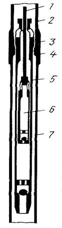 Такие насосы опускают в скважину в собранном виде (цилиндр вместе с плунжером) на насосных штангах и извлекают на поверхность также в собранном виде путем подъема этих штанг. Насос устанавливают и закрепляют при помощи специального замкового приспособления, заранее смонтированного в спускаемых в скважину насосных трубах. В результате для смены вставного насоса (при необходимости замены отдельных узлов или насоса в целом) достаточно поднять на поверхность только насосные штанги, насосные же трубы остаются постоянно в скважине. Таким образом, смена вставного насоса требует значительно меньше времени, чем невставного. Эти преимущества вставного насоса имеют особое значение при эксплуатации глубоких скважин, в которых на спускоподъемные операции при подземном ремонте, затрачивается много времени. Насос скважинный вставной НСВ1 (рис. 5) состоит из трех основных узлов: цилиндра, плунжера 6 и замковой опоры 4. Цилиндр насоса 5 на нижнем конце имеет закрепленный наглухо всасывающий клапан, а на верхнем конце конус 3, который служит опорой насоса. Плунжер 6 подвешивается к колонне штанг при помощи штока 1, конец которого выступает из насоса и имеет соответствующую резьбу для соединения со штангами. С целью уменьшения объема вредного пространства нагнетательный клапан установлен на нижнем конце плунжера. Насос в скважине устанавливается на замковой опоре 4, предварительно спущенной на насосных трубах 2, на нижнем конце которых смонтирована направляющая труба 7. Спущенный и укрепленный в замковой опоре вставной насос работает, как обычный трубный насос. Цилиндры трубных насосов собираются из чугунных втулок длиной 300 мм, а вставных насосов — из стальных втулок такой же длины. В зависимости от длины хода плунжера число втулок в цилиндре составляет от 6 до 17. Плунжеры штанговых насосов изготовляют длиной 1200—1500 мм из цельнотянутых бесшовных стальных труб. Наружная поверхность плунжера шлифуется, хромируется для повышения износостойкости и затем полируется. На обоих концах плунжера нарезана внутренняя резьба для присоединения клапанов или переводников. Клапаны насосов. В штанговых насосах применяют шариковые клапаны с одним шариком — со сферической фаской седла и двумя шариками — со ступенчато-конусной. Для передачи движения от станка-качалки к плунжеру насоса предназначены насосные штанги — стальные стержни круглого сечения длиной 8 м, диаметрами 16, 19, 22 или 25 мм, соединяемые с помощью муфт. Условия эксплуатации штанг определяют повышенные требования к их прочности, поэтому для изготовления штанг применяют сталь высокого качества. Подача насосной установки. Общее количество жидкости, которое подает насос при непрерывной работе, называется его подачей. Фактическая подача насоса почти всегда меньше теоретической и лишь в тех случаях, когда скважина фонтанирует через насос, его подача может оказаться равной или большей, чем теоретическая. Отношение фактической подачи насоса к теоретической называется коэффициентом подачи насоса. Эта величина характеризует работу насоса в скважине и учитывает все факторы, снижающие его подачу. Работа штанговой установки считается удовлетворительной, если коэффициент подачи ее не меньше 0,5—0,6. Эксплуатация скважин в осложненных условиях. Многие скважины эксплуатируются в осложненных у