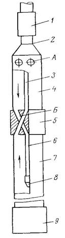 Защитные приспособления на приеме насоса. Все мероприятия режимного и технологического характера по снижению вредного влияния газа и песка на работу штангового насоса обычно дополняются применением защитных приспособлений у приема насоса — газовых, песочных якорей или комбинированных газопесочных якорей. Одна из конструкций газопесочного якоря показана на рис. 6. Этот якорь состоит из двух камер — газовой (верхней) 4 и песочной (нижней) 7, соединенных с помощью специальной муфты 5, в которой просверлены отверстия Б. В верхней камере якоря укреплена всасывающая трубка 3, ав нижней — рабочая труба 6, снабженная конической насадкой 8. Якорь присоединяется к приему насоса 1 через переводник 2, одновременно связывающий корпус якоря со всасывающей трубкой. На нижнем конце песочной камеры навинчена глухая муфта 9. При работе насоса жидкость из скважины поступает через отверстия А в газовую камеру 4, где газ отделяется от нефти. Затем отсепарированная нефть через отверстия Б и рабочую трубу 6 направляется в песочную камеру 7, отделившаяся от песка жидкость поднимается по кольцевому пространству в песочной камере и поступает через отверстия в специальной муфте во всасывающую трубку 3 на прием насоса 2. В зависимости от количества песка, поступающего с нефтью при добыче, выбирают длину корпуса песочной камеры. Для лучшего выноса песка иногда успешно применяют насосные установки с полыми (трубчатыми) штангами. В качестве таких штанг используют насосно-компрессорные трубы диаметрами 33, 42, 48 мм. Трубчатые штанги являются одновременно и звеном, передающим плунжеру насоса движение от станка-качалки, и трубопроводом для откачиваемой из скважины жидкости. Эти штанги присоединяют к плунжеру с помощью специальных переводников. Предотвращение отложений парафина. При добыче парафинистой нефти в скважинах возникают осложнения, вызванные отложением парафина на стенках подъемных труб и в узлах насоса. Отложения парафина на стенках подъемных труб уменьшают площадь кольцевого пространства, в результате чего возрастает сопротивление перемещению колонны штанг и движению жидкости. По мере роста парафиновых отложений увеличивается нагрузка на головку балансира станка-качалки и нарушается его уравновешенность, а в случае сильного запарафинивания труб снижается и коэффициент подачи насоса. Отдельные комки парафина, попадая под клапаны, могут нарушить их герметичность. При добыче нефти с большим содержанием парафина обычно применяют методы устранения отложений парафина, при которых не требуются остановка скважины и подъем труб на поверхность: 1) очистка труб механическими скребками различной конструкции, установленными на колонне штанг; 2) нагрев подъемных труб паром или горячей нефтью, закачиваемой в затрубное пространство; 3) нагрев подъемных труб электрическим током — электродепарафинизация. В настоящее время при насосной эксплуатации широко применяют насосно-компрессорные трубы, футерованные стеклом или лаками. В таких трубах парафин не откладывается, и эксплуатация скважин происходит в нормальных условиях.