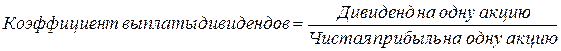 D – сумма дивиденда, полученного в течение периода владения акцией; Рпр – цена продажи акции; Р – цена покупки акции. · Коэффициент выплаты дивидендов. Указывает, какая часть чистой прибыли израсходована на выплату дивидендов, и рассчитывается как в процентах, так и в относительном выражении: