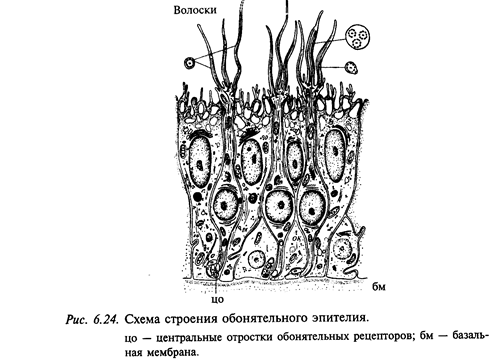 Hoc человека имеет три камеры: нижнюю, среднюю и верхнюю. Нижняя и средняя камеры выполняют, по сути санитарную роль, согревая и очищая вдыхаемый воздух. Стенки верхней камеры выстланы нейроэпителием. Обонятельный эпителий, выстилающий обонятельную область носа, имеет толщину 100-150 мкм и содержит рецепторные, а также расположенные между ними опорные клетки (рис. 6.24). Он окрашен в желтый цвет вследствие присутствия пигмента в опорных клетках и рецепторах. Убедительные доказательства участия этого пигмента в рецепции запахов отсутствуют. Количество обонятельных рецепторов весьма велико и в значительной степени определяется площадью, занимаемой обонятельным эпителием и плотностью рецепторов в нем. Вообще в этом отношении человек относится к плохо обоняющим существам (микросматик). Например, у ряда животных – собаки, крысы, кошки и др.- обонятельная система значительно более развита (макросматики).