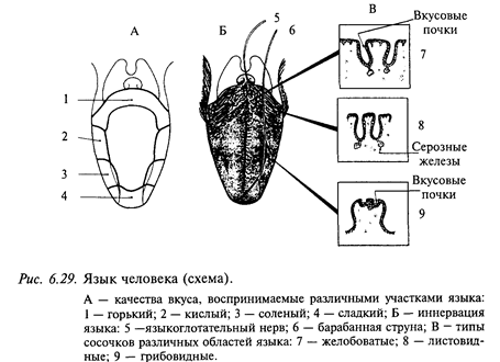 Функциональная роль вкусовой системы у позвоночных животных разных видов неодинакова. У наземных животных вкусовая рецепция связана с оценкой качества пищи или отвергаемых веществ, тогда как у рыб вкус играет роль дистантной рецепции и наряду с обонянием обеспечивает пространственную ориентацию. Это связано с тем, что вкусовые почки у рыб обнаруживаются за пределами ротовой полости и находятся на губах, жабрах, плавниках, голове, туловище. Вкусовая чувствительность играет большую роль в формировании поведения наземных млекопитающих. Благодаря этой чувствительности животные выбирают адекватные пищевые вещества. Однако обычно ощущение вкуса сопровождается тактильными и температурными характеристиками пищи, находящейся в ротовой полости, а также ее запахом. Сочетание всех этих раздражений создает ощущение вкуса и адекватную реакцию животного на пищевое вещество. Вкусовая рецепция у человека осуществляется вкусовыми луковицами языка, которые встроены в более крупные структуры - сосочки. В каждом сосочке находится по нескольку вкусовых луковиц. Имеются следующие разновидности вкусовых сосочков: на кончике и по бокам языка - грибовидные, по бокам - листовидные, а у основания языка - желобоватые (рис. 6.29). Клетки вкусовых луковиц проходят перпендикулярно через всю толщу эпителия, достигая базальными концами мембраны, а в апикальной части они образуют вкусовой канал, соединенный с ротовой полостью через вкусовую пору. Вкусовая луковица состоит из 30-80 уплощенных, вытянутых веретенообразных клеток, тесно прилегающих друг к другу наподобие долек апельсина. Тонкие афферентные волокна (2/3 волокон не миелинизированы) образуют синаптические контакты на средней и базальной частях этих клеток. Если перерезать волокна, иннервирующие вкусовую луковицу, то последние полностью дегенерируют. Регенерация нерва ведет к восстановлению луковицы. Пройдя через вкусовую пору, молекулы вещества попадают на верхушки вкусовых клеток, на апикальной поверхности которых имеются микроворсинки. В результате взаимодействия вкусовых молекул с мембраной клеток в последних возникает генераторный потенциал, а в соответствующих афферентных волокнах - импульсный разряд.