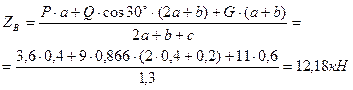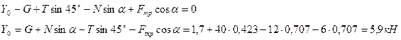 Дано: G =1,7 кН; Q =12 кН; fтр =0,15; α =25о; a =0,15 м; в =0,1 м; с =0,03 м; (cosα =0,906; sinα =0,423). Решение: