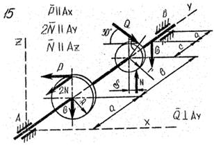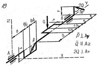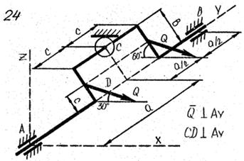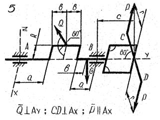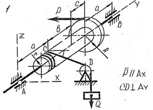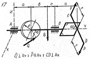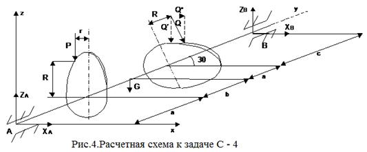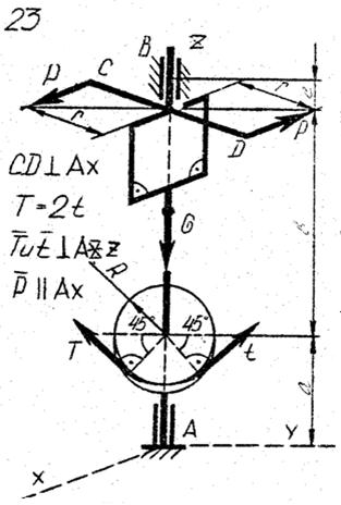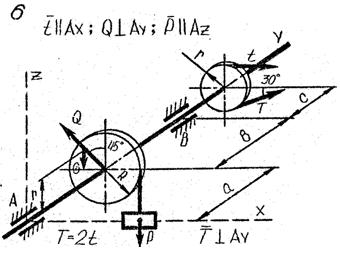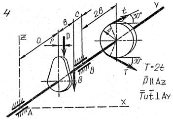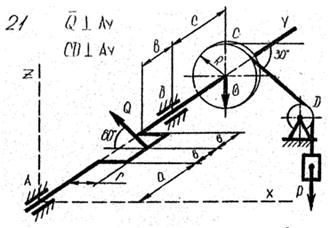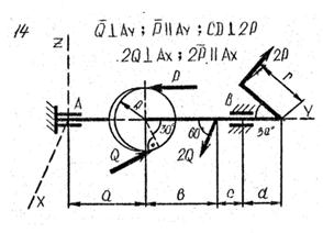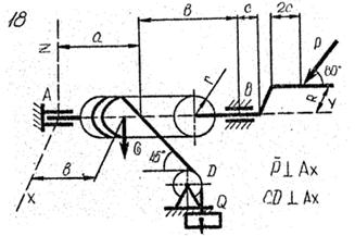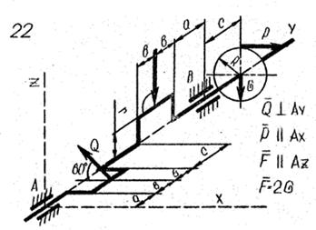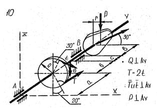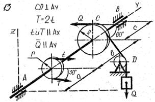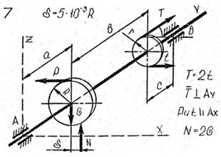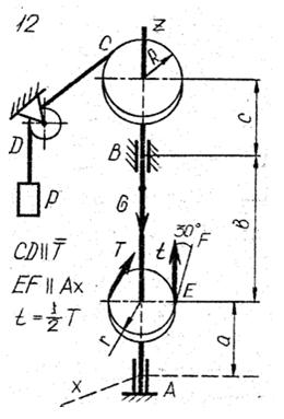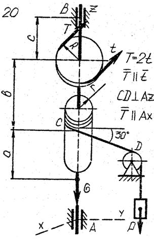 Дано: Q =9 кН; T =5 кН; G =11 кН; a =0,4 м; b =0,2 м; c =0,3 м; R =0,2 м; r =0,05 м.