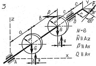 Пример выполнения расчетно-графической работы №1 Задача С – 3. Определить минимальное значение силы Р и реакции опорной системы, находящейся в равновесии. Трением в опорных устройствах пренебречь. Силы тяжести стержней, колодок и нитей не учитывать.